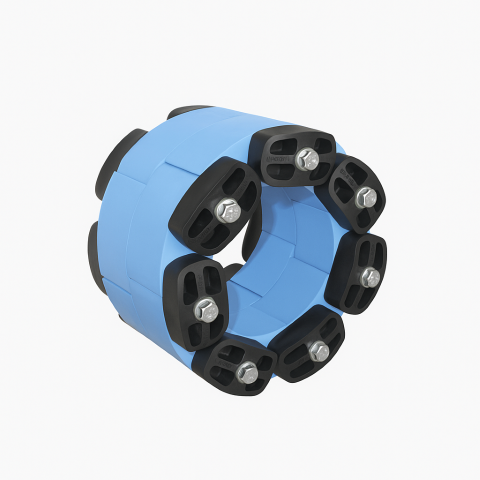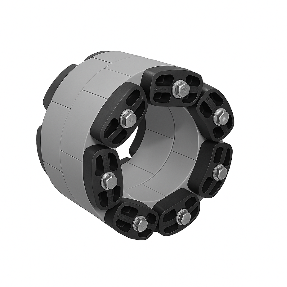 Sello modular de caucho sintético y placas de presión industriales, diseñado para sellar espacios anulares entre tuberías y muros, disponible en 21 tamaños, soporta hasta 275,79 kPa (92,28 pies de presión de cabeza). De instalación rápida y sin herramientas especiales, ofrece reutilización, aislamiento eléctrico y acústico, y absorción de vibraciones y golpes.